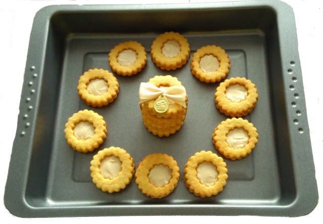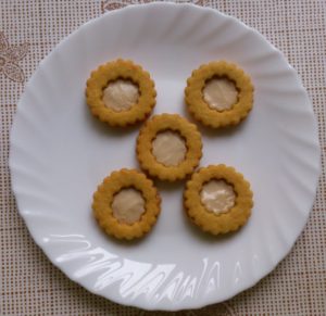 7) Na plechu necháme sušenky vychladnout a později je můžeme promazat krémem či džemem dle chuti a slepit. My jsme v receptu použili kokosový BIO krém, který chutná jako bílá Nutella.