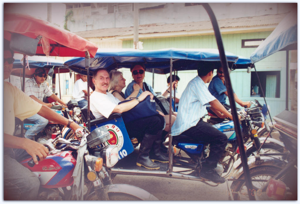 …“Odcházíme z hotelu. Naše uši dostávají mimořádnou porci decibelů šířících se z rachotících motorových rikš. A s tím rachotem se vydáváme na břeh Ucayali. Do všech přístupných otvorů našich těl se vdírá jemný červený prach. Táhne se za těmito exotickými dopravními prostředky jako stín. A čím dále jsme od města, tím je hustší.